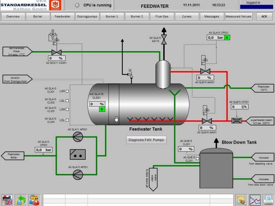 Es wurden redundante fehlersichere S7-414H - Steuerungen eingesetzt. Das fehlersichere Programm für die Brennersteuerung wurde mit dem Siemens Paket "Feuerungstechnik V1.3 für F/FH-Systems" erstellt und erfolgreich in Betrieb genommen. Die Visualisierung erfolgt mittels IPC unter WinCC 7.0 mit redundanter Busanbindung (RedConnect). Die lokale Bedienung erfolgt über das angeschlossene Touch-Display. Die DCS-Kommunikation wurde ebenfalls redundant über ModBus aufgebaut. Hier kommunizieren wir mit dem T-3000-System von Siemens.