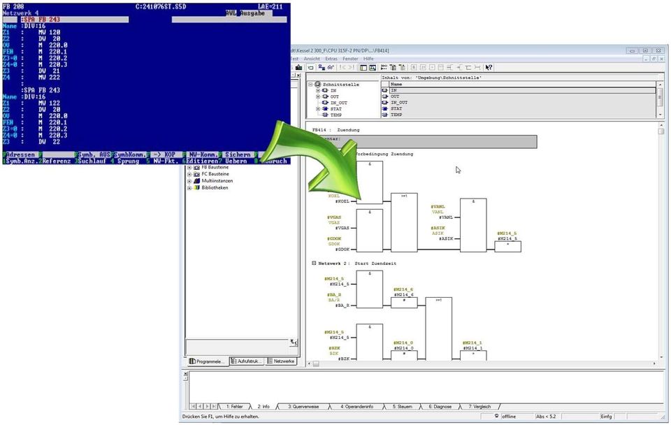 Es sollen zwei bestehende S5-95F-Steuerungen zweier Kessel gegen aktuelle S7-300F Steuerungen ausgetauscht werden. Die Programme der 95F-Steuerungen sollen möglichst 1:1 migriert werden. Die Anbindung an die S7 des Allgemeinteils der Kessel soll danach auch wieder funktionell sein.