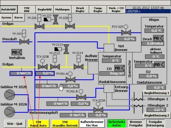 Die Steuerung einer thermischen Nachverbrennung (derzeit S5-95F) soll auf den aktuellen Stand der Technik gebracht werden. Ferner sollen die Anlagenzustände visualisiert werden und eine Bedienung über HMI ermöglicht werden.